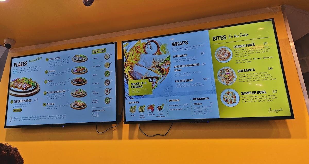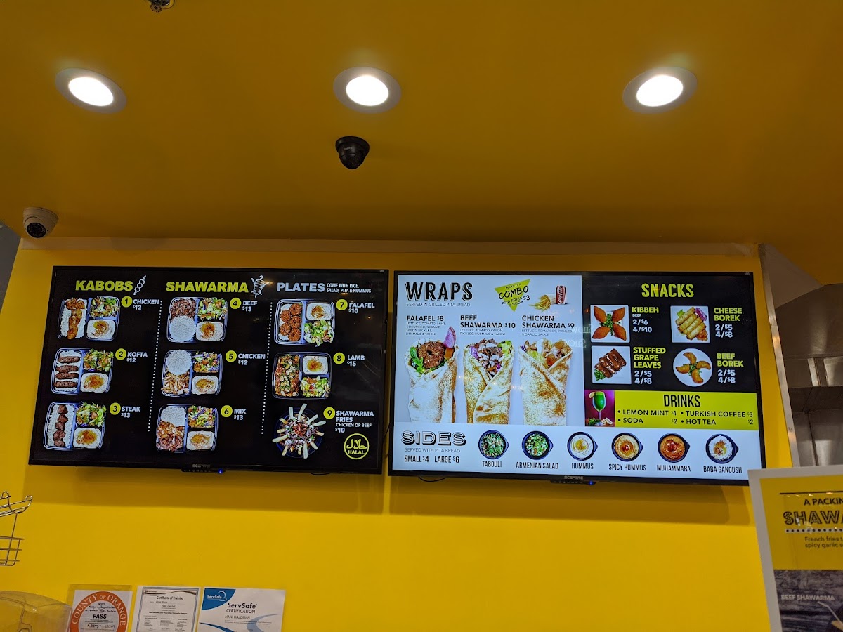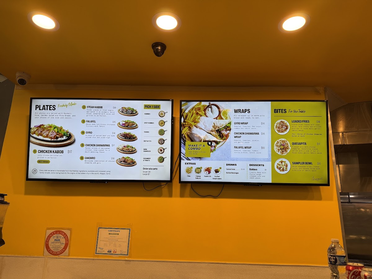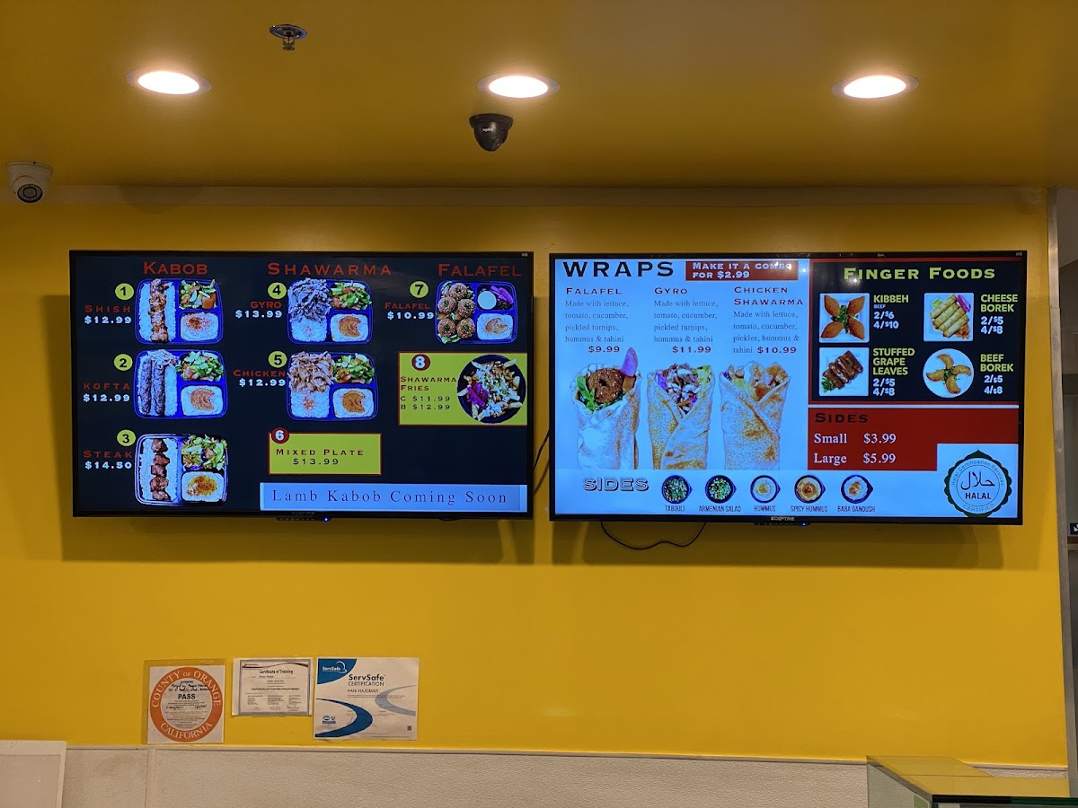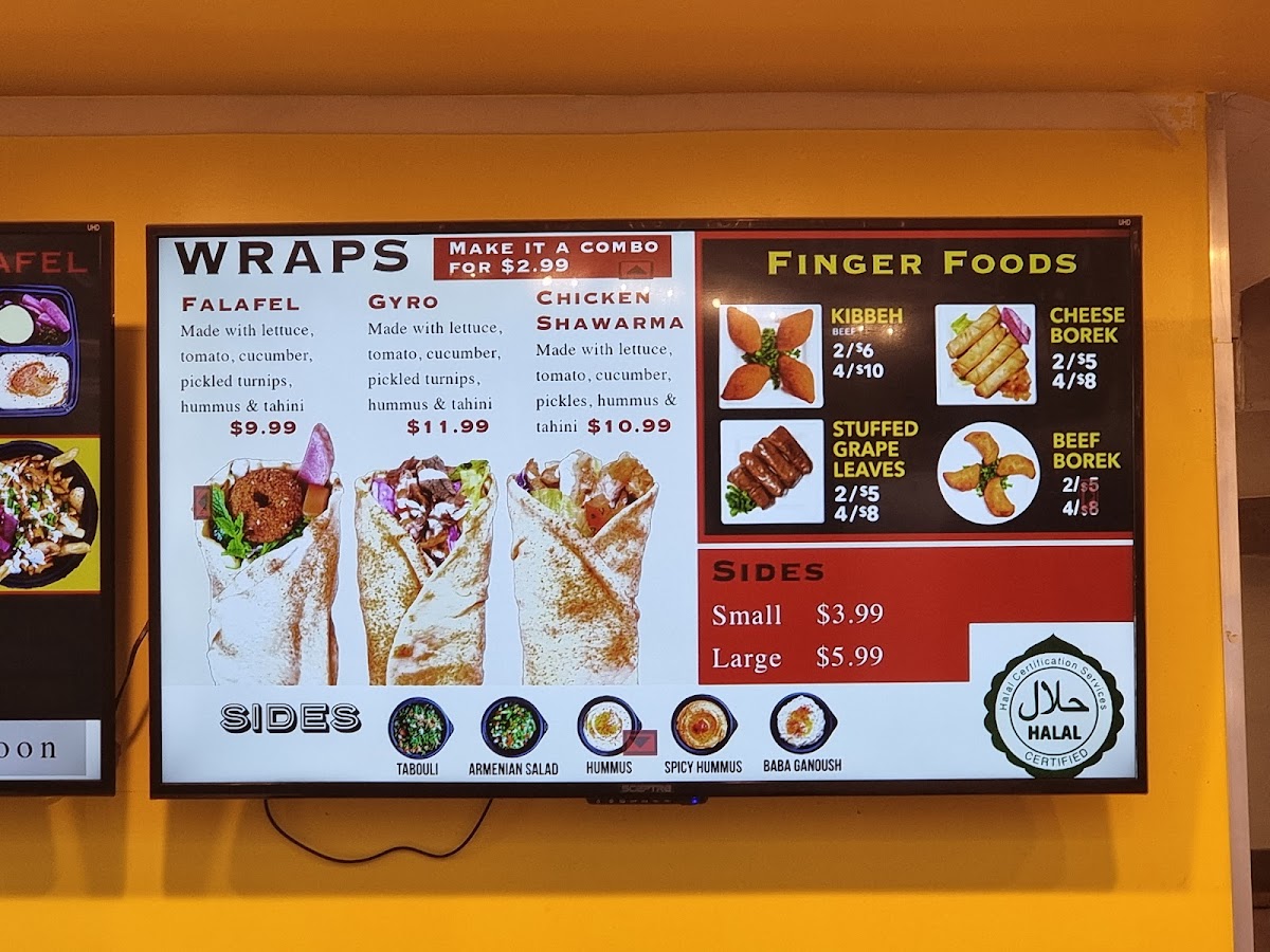 A blend of spiced beef and lamb sliced thin and piled high. Served with basmati rice, garden salad, pita bread, and your choice of one side and sauces.